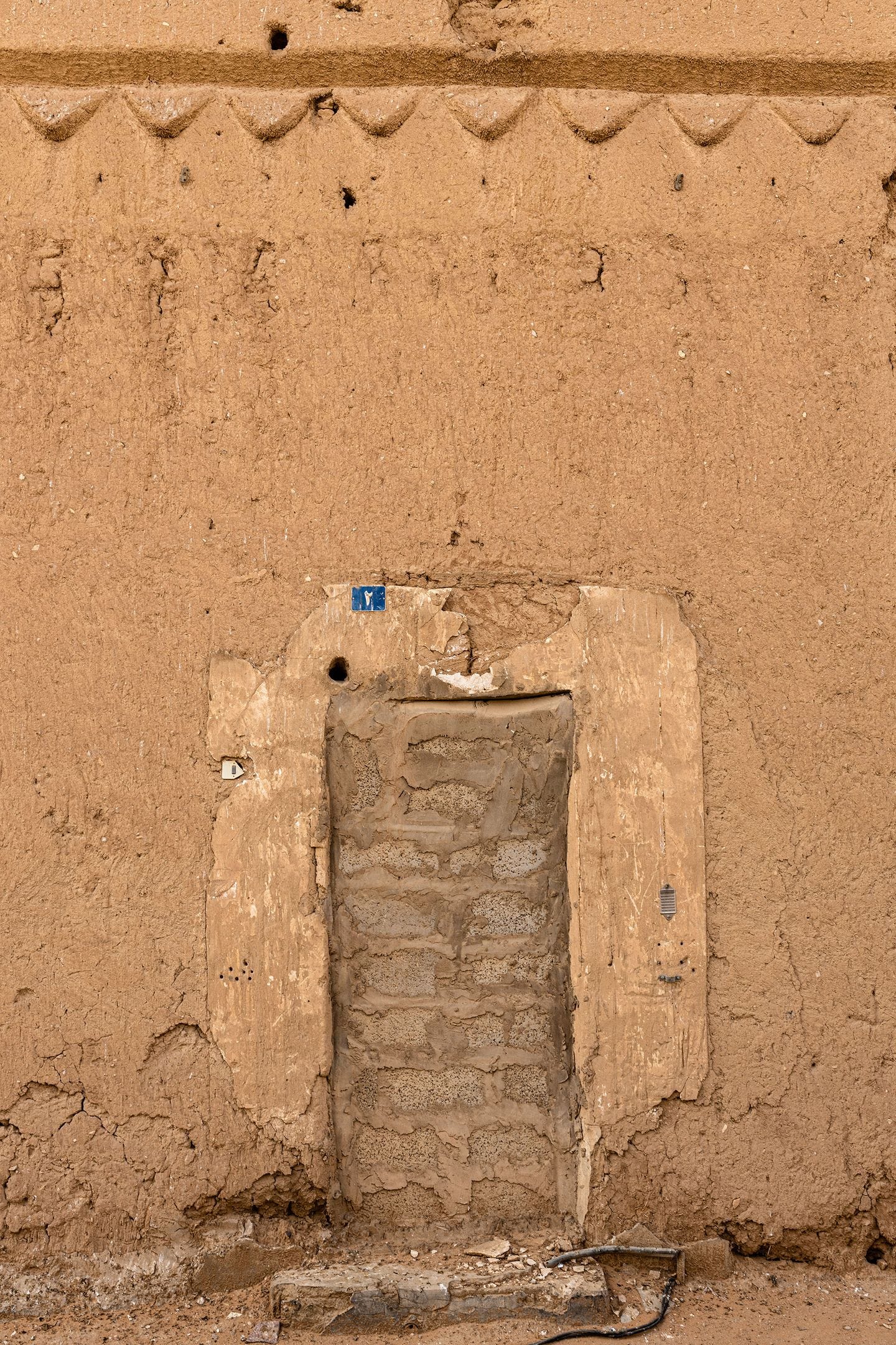 لفت إنتباهي الباب المغلق بالإسمنت في الصورة التالية، لمبنى انهارت أغلب جدرانه. فقد وصلت له الكهرباء، وله جرس على يسار الباب، ووصلت له خدمة الهاتف لوجود اللوحة المعدنية للمقسّم على يمين الباب، وله عنوان لوجود رقم المنزل أعلى الباب.