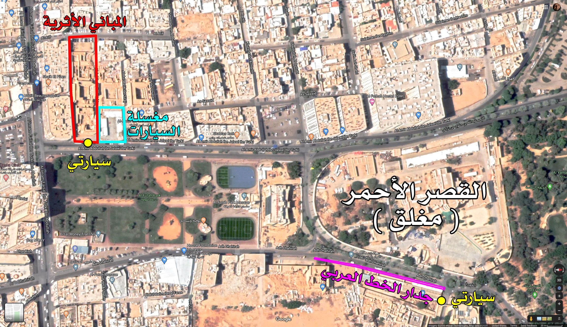 توقفت بسيارتي في أحد مواقف مكتبة الملك عبدالعزيز العامة (النقطة الصفراء أدنى اليمين) القريبة من الجدار (البنفسجي)، حيث أن وقت الفعالية يبدأ العصر وينتهي مساءً، وهنا يقف مسؤول الأمن الذي استأذنت لتصوير الجدار.