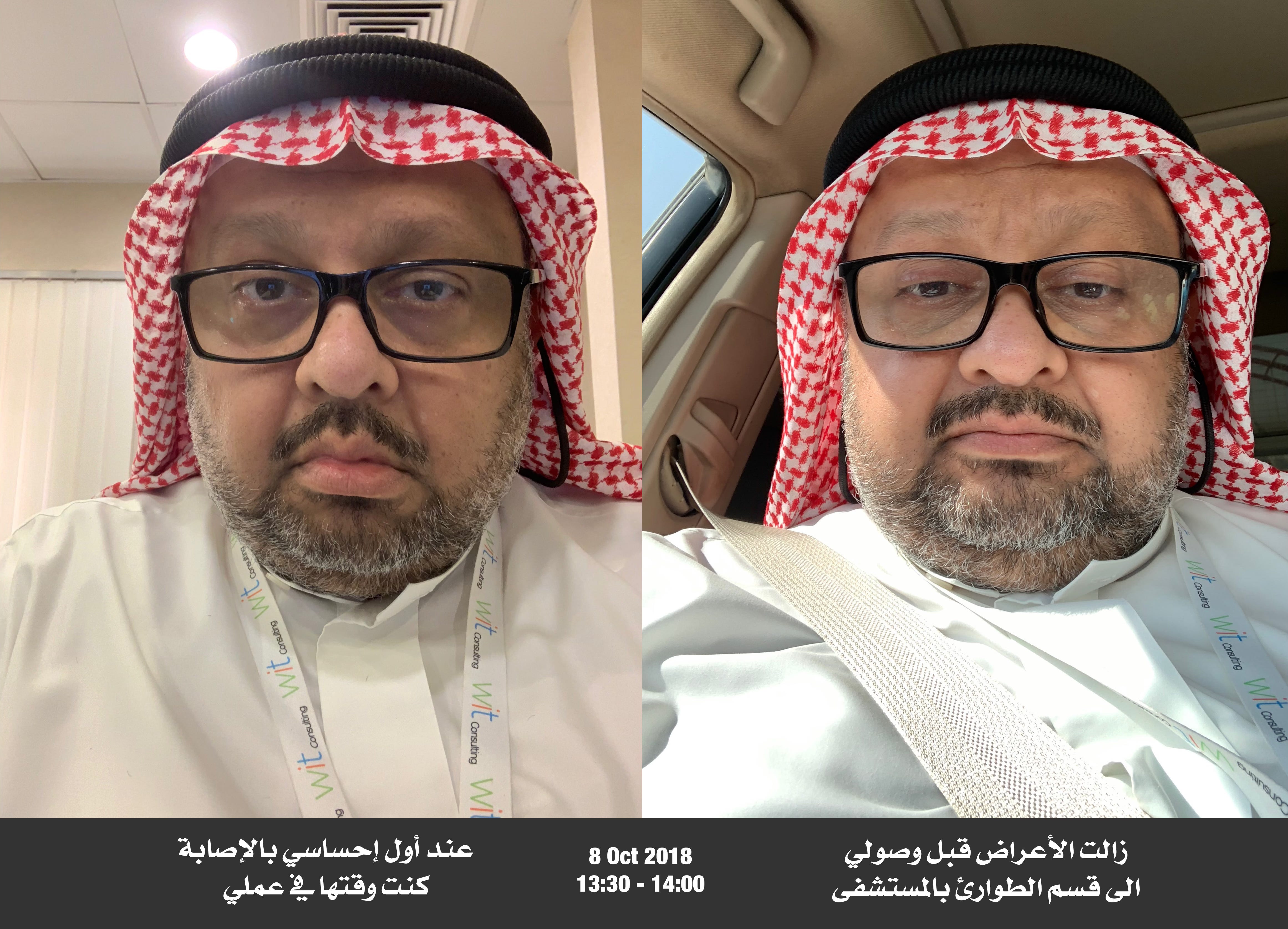 في ٨ أكتوبر ٢٠١٨م، الساعة الواحدة والنصف بعد الظهر، فقدت الإحساس بذراعي اليسار. عند محاولتي رفع ذراعي، كان يتخبط يميناً ويساراً وكأنه سمكة تفارق الحياة. عندها سمعت صوت نَفَسي، فنظرت بالمرآة القريبة، وإذا بوجهي مائل من اليسار. عند محاولتي للكلام، لم استطع النطق بكلام مفهوم.