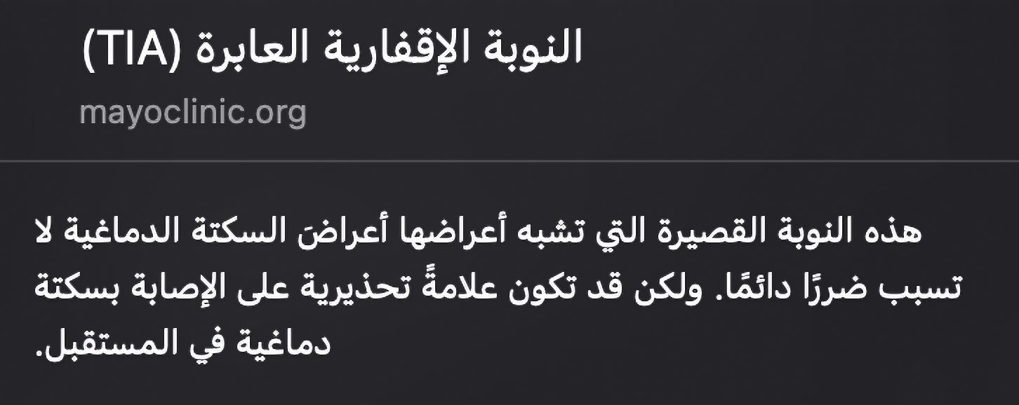 عندها توقعت بأنها جلطة بالدماغ (من اللي نشوفه بالتلفزيون). صورت نفسي فيديو، وأرسلته الى أسرتي. ثم طلبت من زميل بالعمل ليأخذني الى المستشفى، حيث كانت اسرتي بانتظاري في قسم الطوارئ. وبعد الفحص كان التشخيص جلطة خفيفة بالدماغ، وطبياً، عنوان هذا المقال.