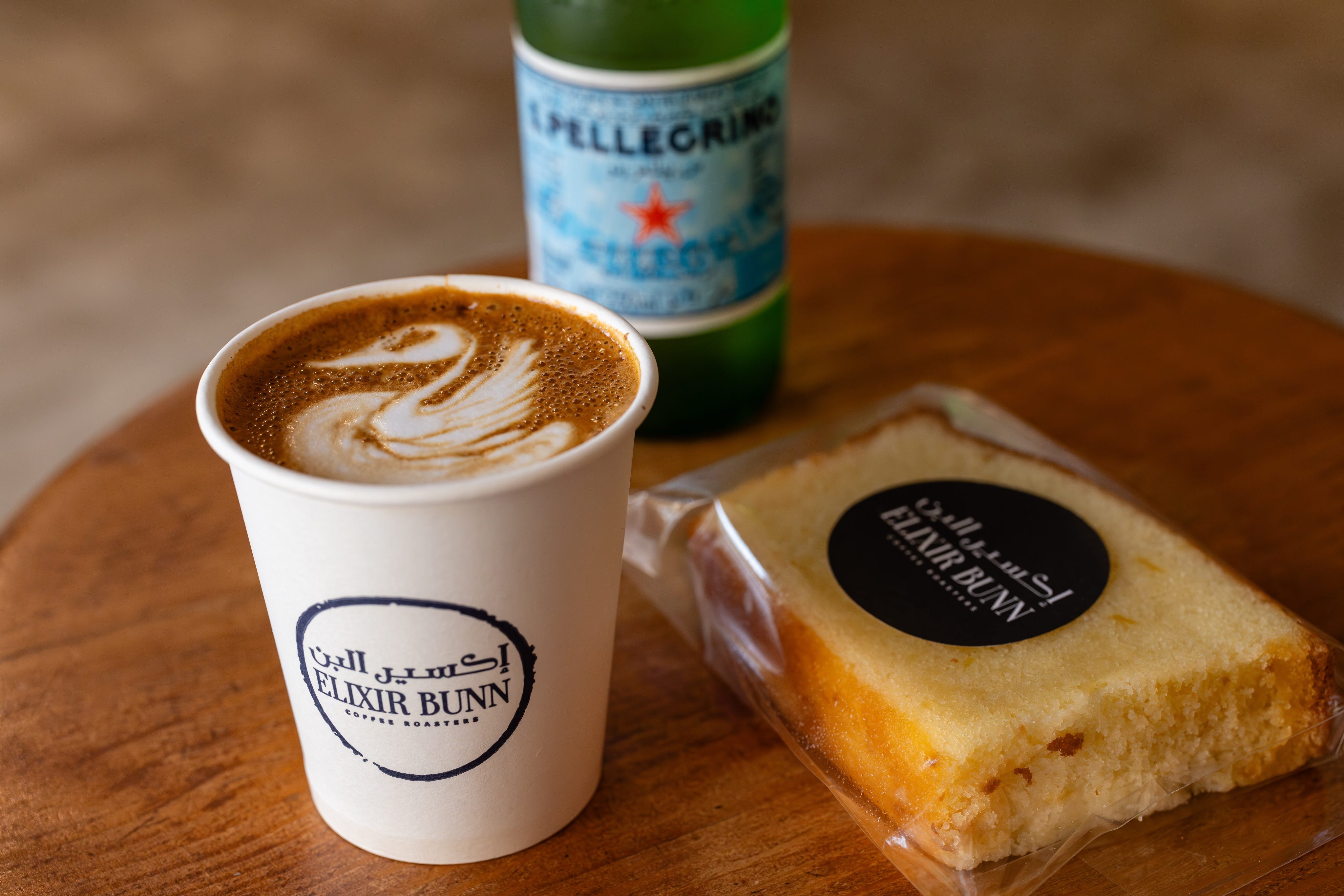 بعد المشي بالجو المنعش 🥵 أحتاج وقفة طاقة.. قهوة (فلات وايت)، وكيكة ليمون، مع ماء فوار باااااارد.