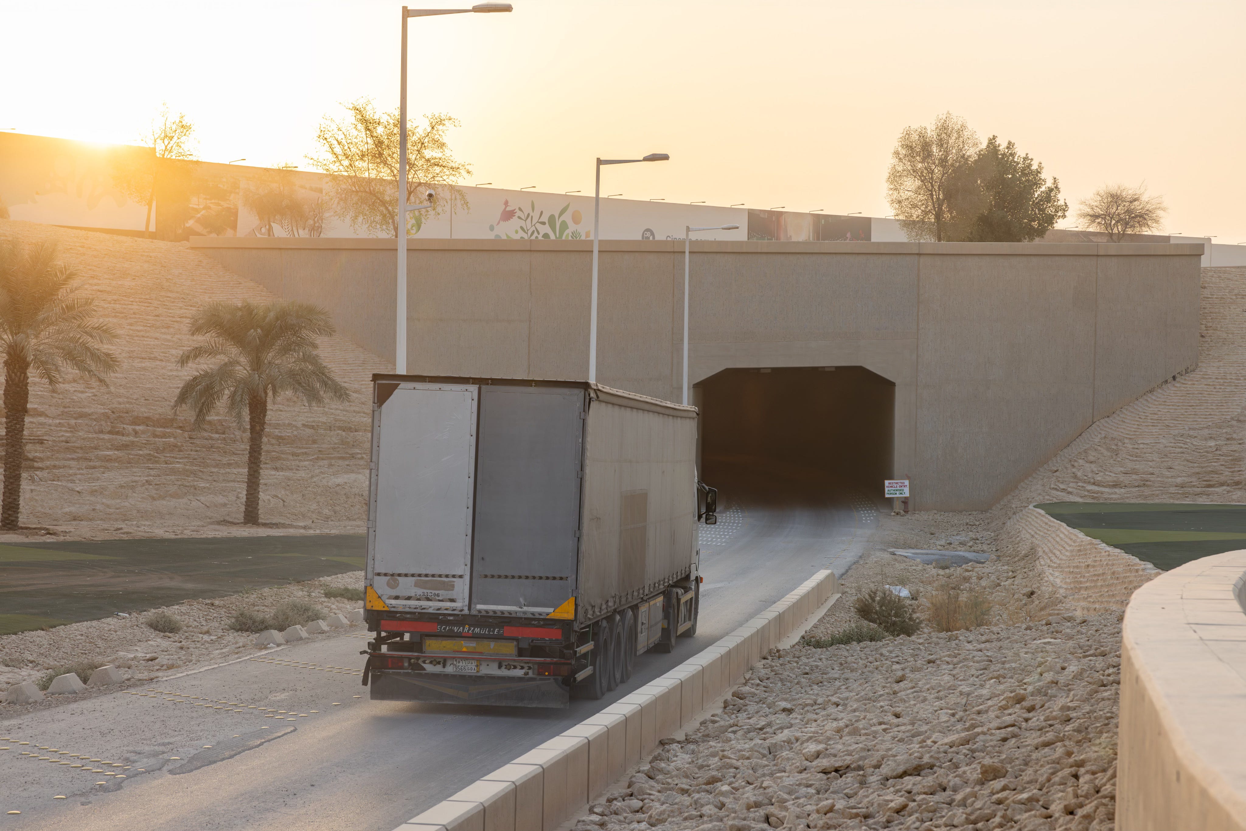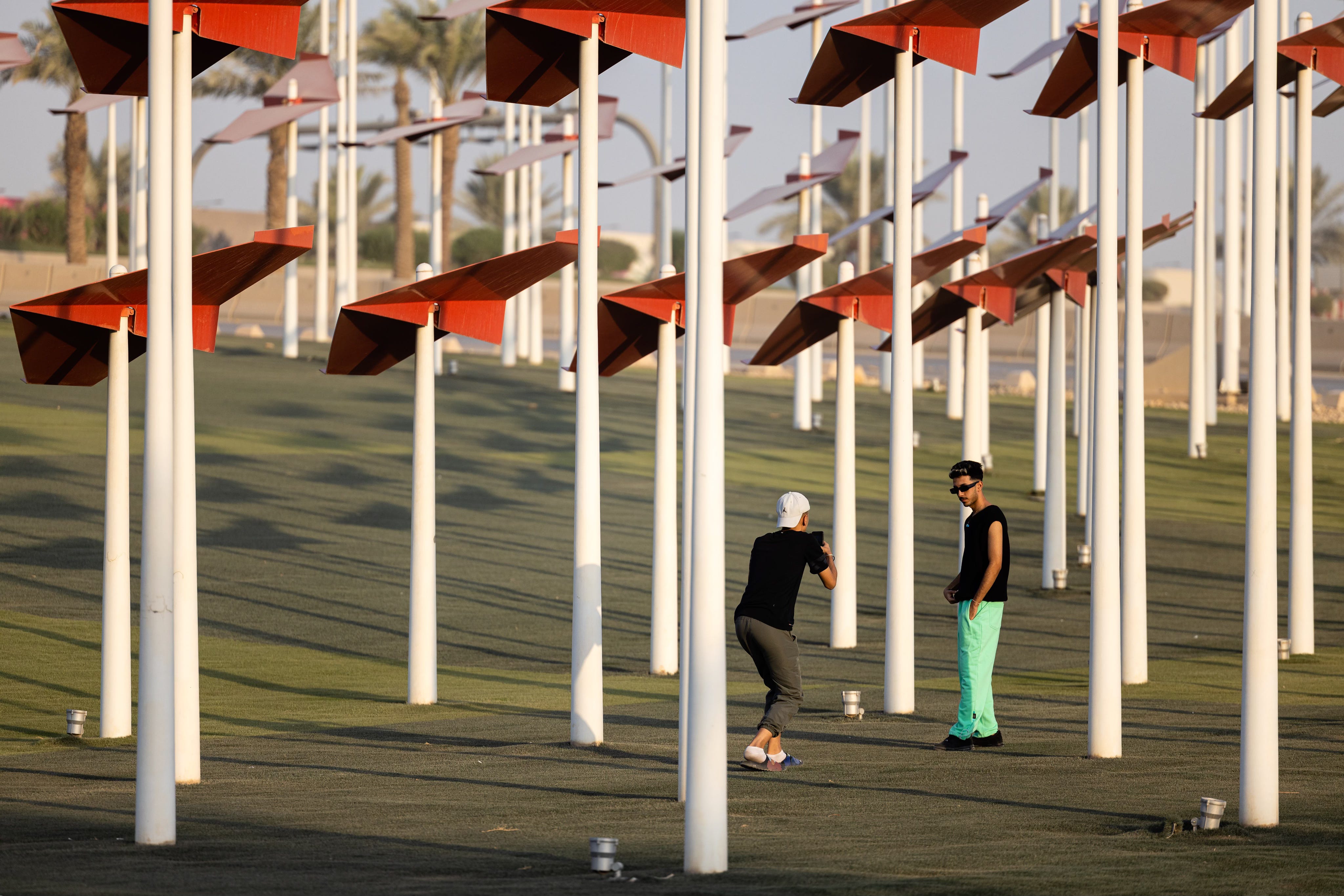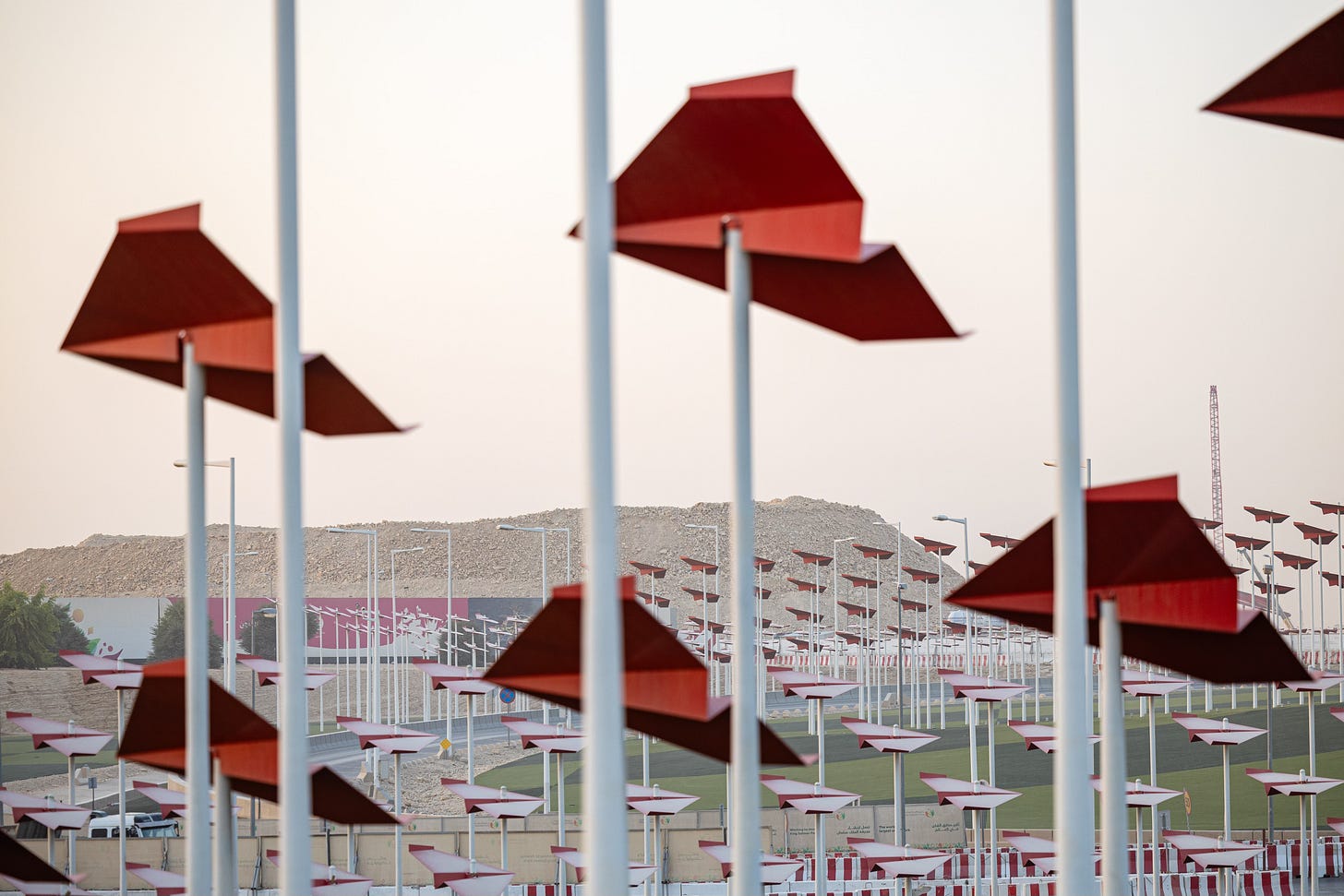 من مسافة بعيدة، أشوف حجم هالمجسمات بسيط. لكن ضخامة الحجم تظهر إذا كنت قريب، تخاف لا تطيح عليك... وشاحنات الإنشاءات رايحة جاية، ويمشي معهم الكوادر المتنوعة (عمال وفنيين ومهندسين...).