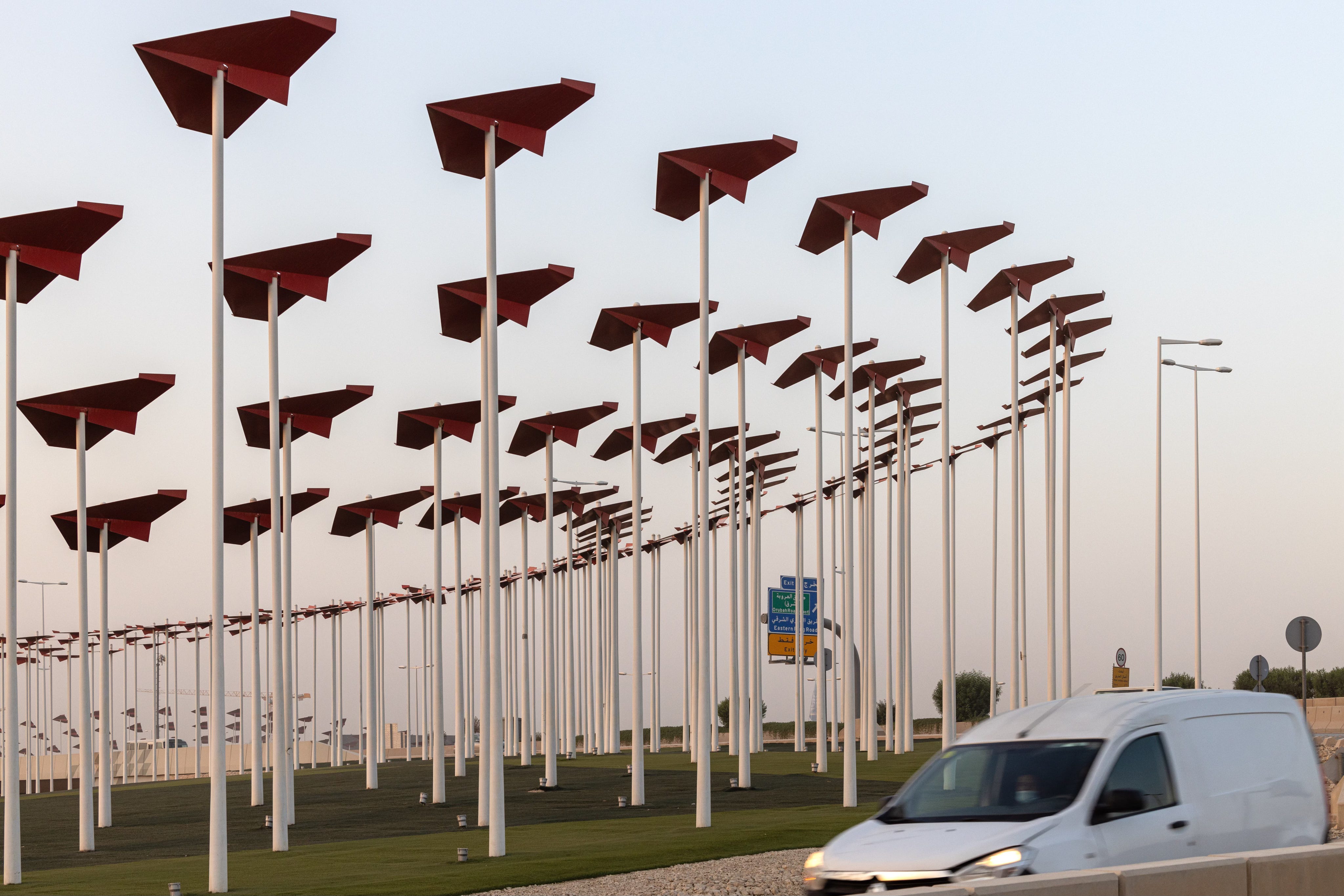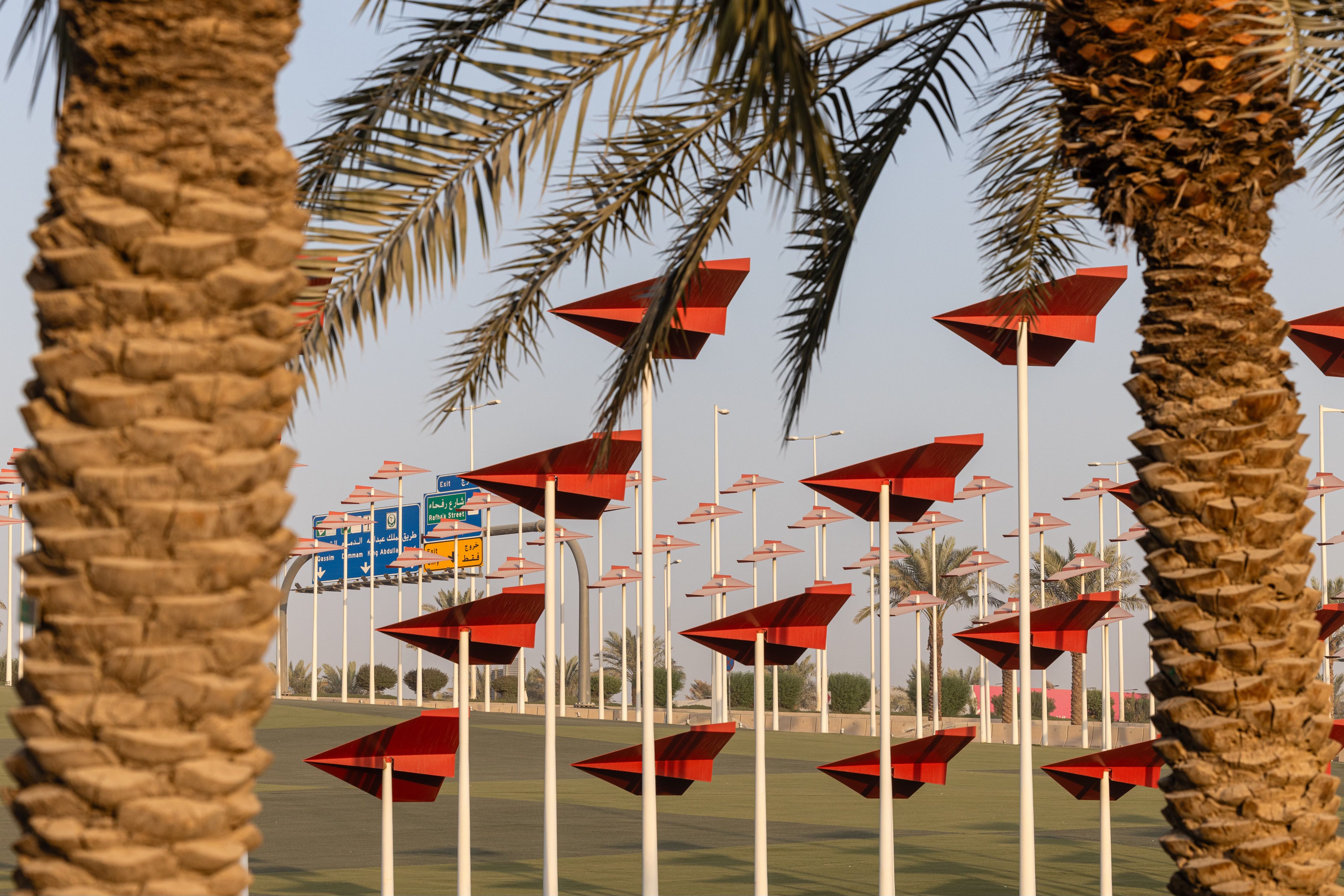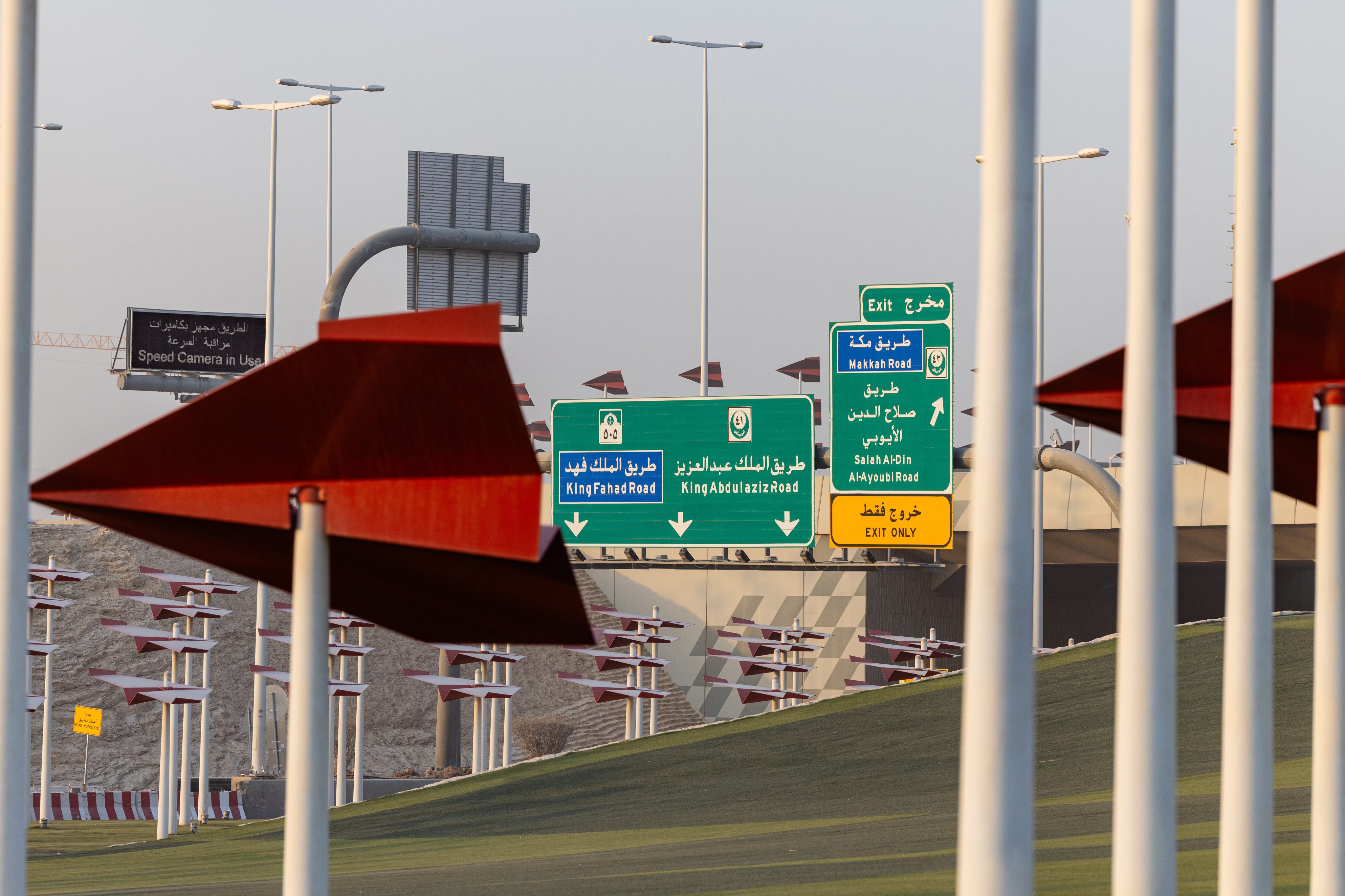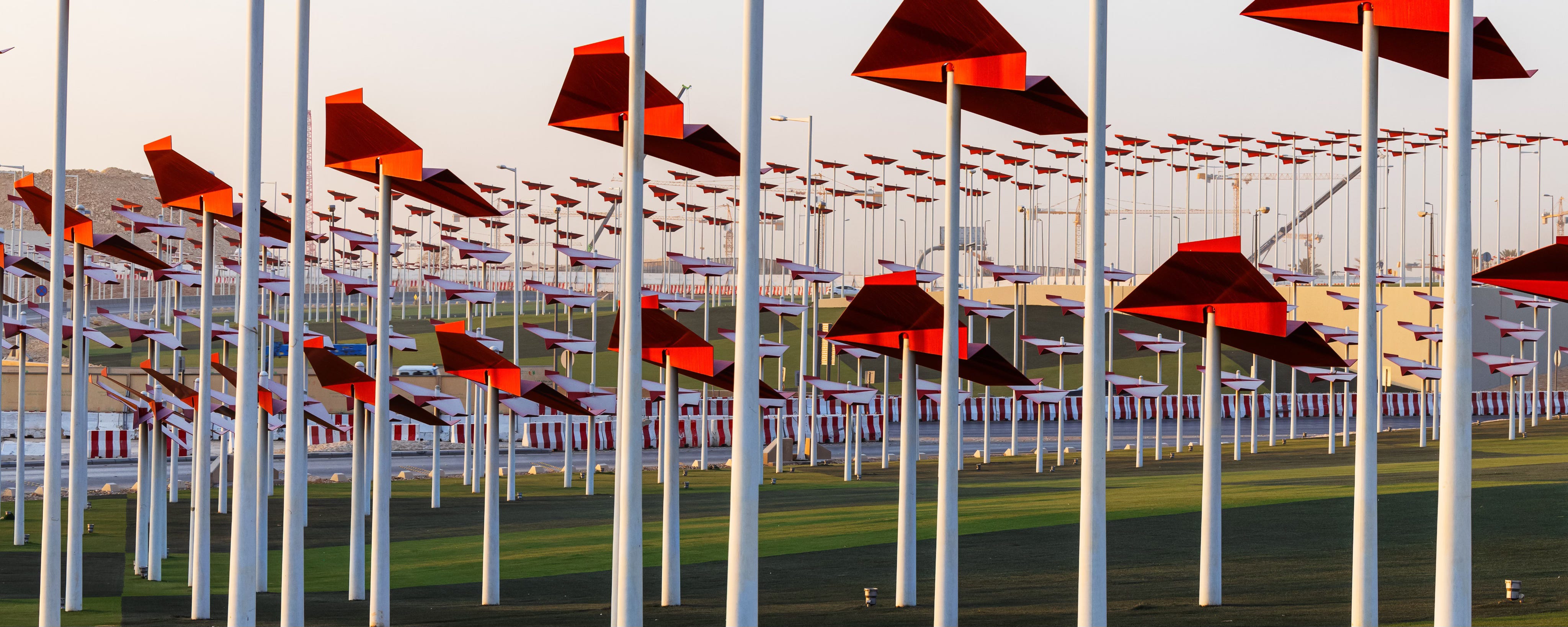 من مسافة بعيدة، أشوف حجم هالمجسمات بسيط. لكن ضخامة الحجم تظهر إذا كنت قريب، تخاف لا تطيح عليك... وشاحنات الإنشاءات رايحة جاية، ويمشي معهم الكوادر المتنوعة (عمال وفنيين ومهندسين...).
