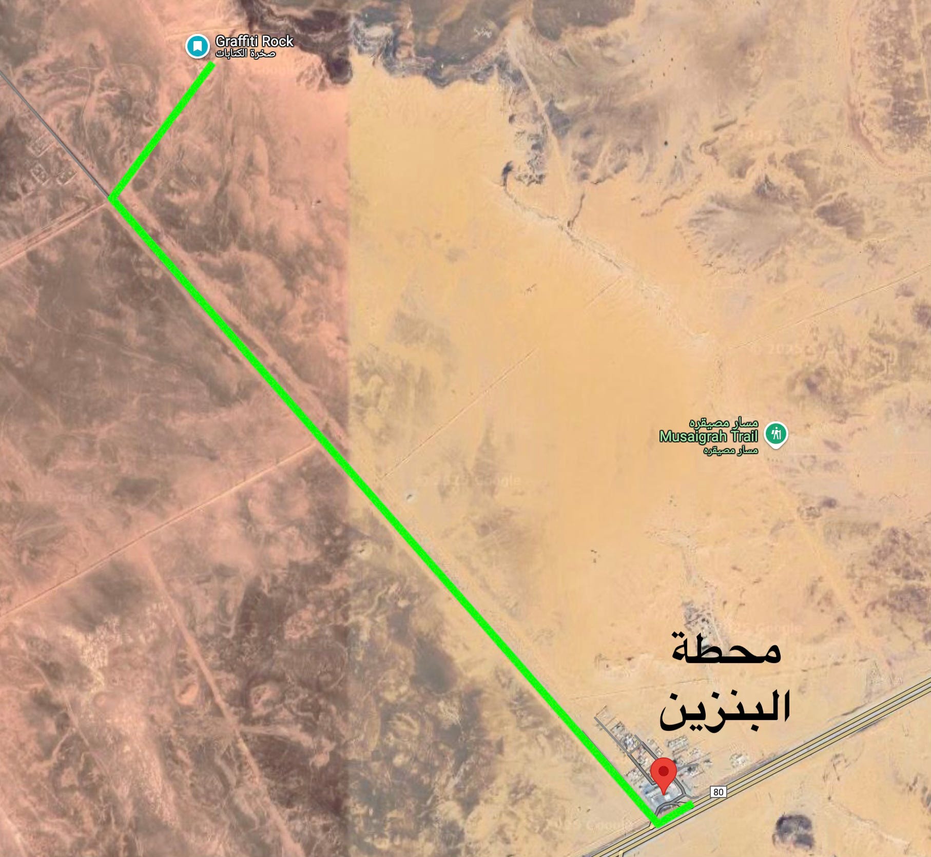تطبيق خرائط قوقل لم يوصلني إلى الموقع الأثري ولكن أوصلني إلى محطة بنزين الماسة (الشدادية)، يليها مباشرة الى اليمين، الطريق المعبّد الجديد الذي أخذني إلى الموقع الأثري (للجزء الأخير، نحتاج الخروج من الطريق المعبد للوصول الى الموقع الأثري). أقترح الوقوف في المحطة لبعض المرطبات، وفحص خرائط قوقل جيداً لمعرفة الطريق.