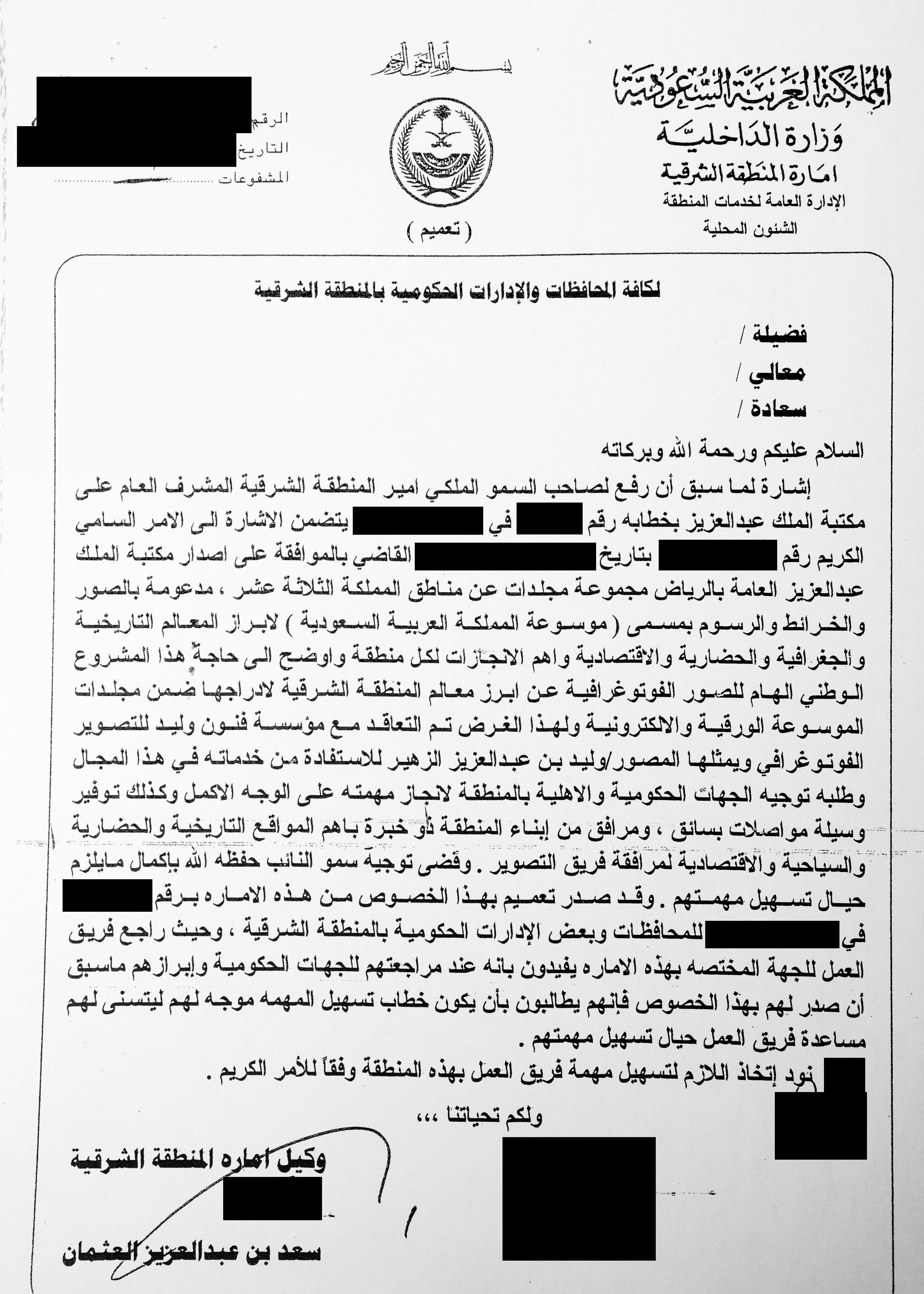 كانت مكتبة الملك عبدالعزيز العامة هي الجهة المشرفة على مشروع موسوعة المملكة العربية السعودية، وأعجبتهم صوري التي قدمت في مشروع الكتيب وفي موقعي. وتم التعاقد على تصوير مواقع محددة في المنطقة الشرقية، تم تحديدها من مجموعة من الكتّاب والمؤرخين في المكتبة، مع استخراج التصاريح الأمنية المطلوبة.
