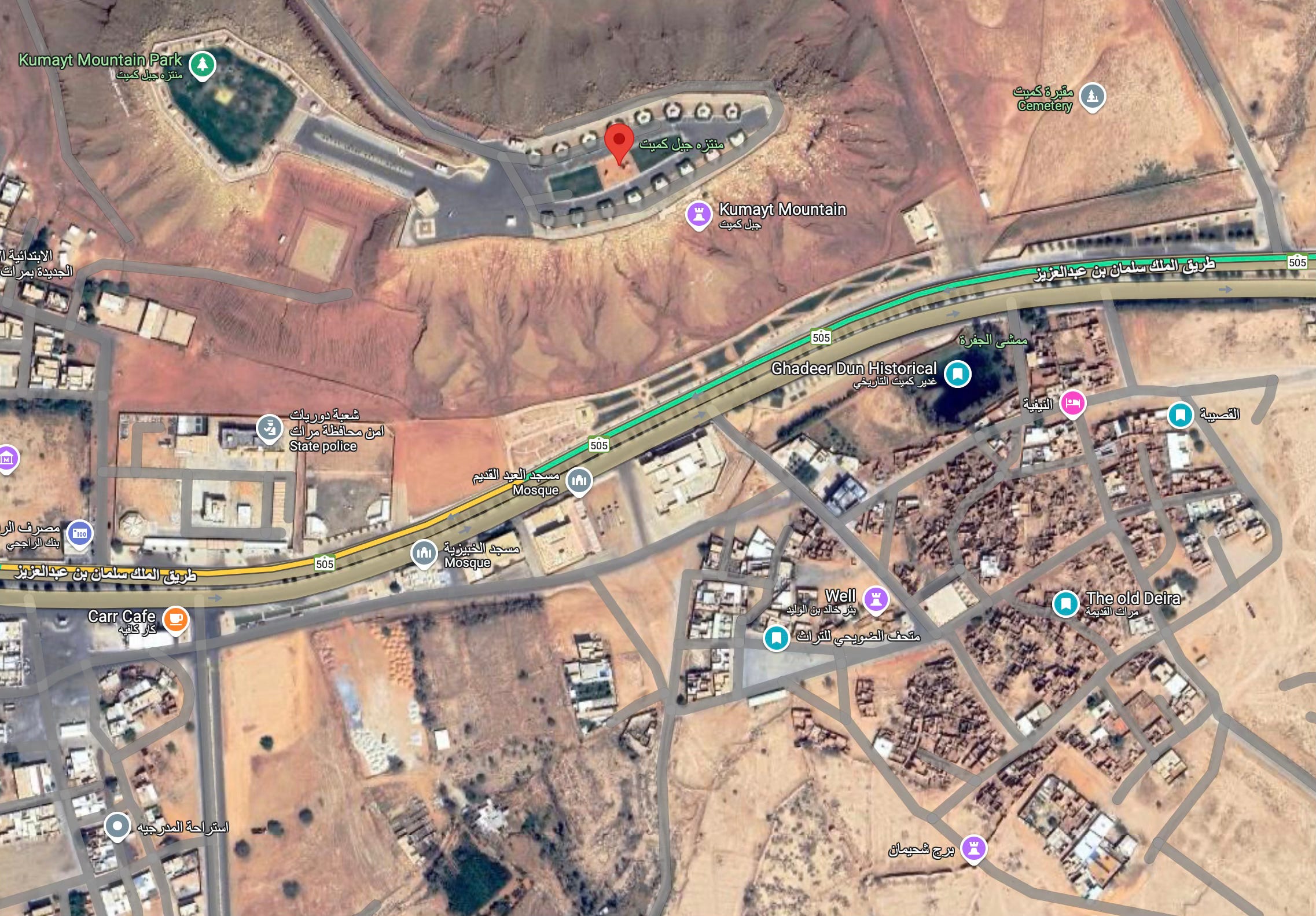 يوجد منتزه في أعلى جبل كميت (التقطت الصورة التالية منه)، نظيف ومرتّب ويطّل على منطقة الديرة القديمة. وغدير كميت واضح في يسار الصورة، ويقع بئر خالد بن الوليد يمين أعلى الصورة. توجد بيوت مأهولة بالسكان، ومساجد، ومتحف الضويحي (كان مغلق تطبيقاً للإجراءات الاحترازية).